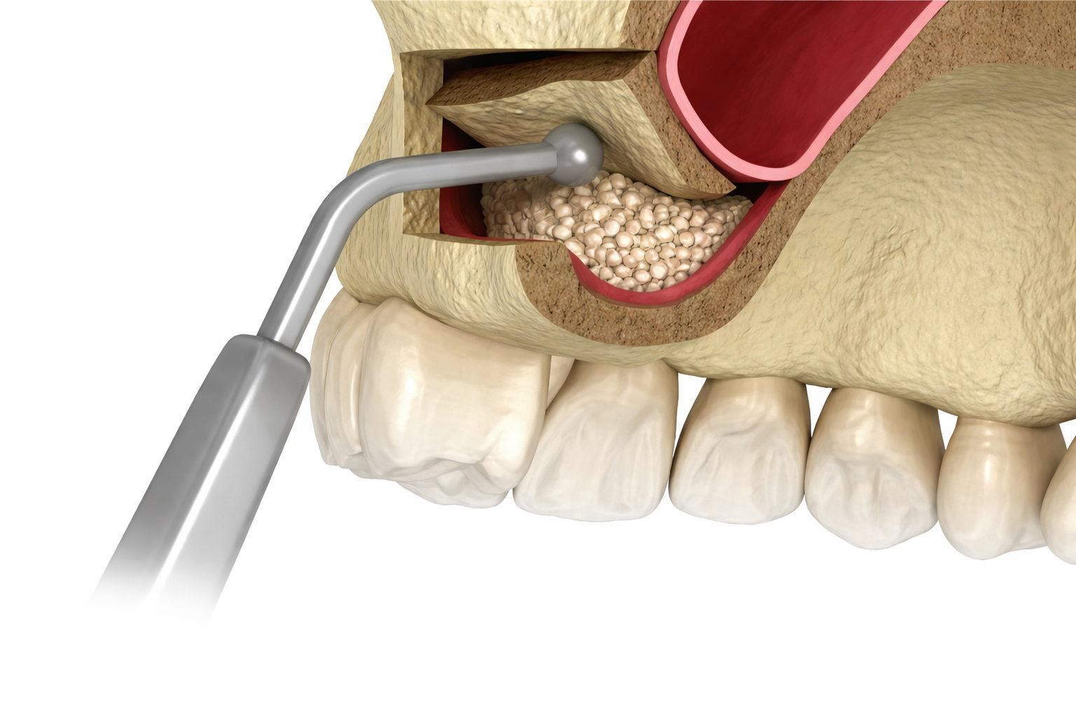 Метод применяется при выраженном дефиците костной ткани, когда требуется значительное увеличение ее высоты. Доступ формируется через боковую стенку верхней челюсти, после чего аккуратно приподнимается мембрана гайморовой пазухи и образовавшееся пространство заполняется костным материалом. Позволяет создать достаточный объем кости для надежной установки импланта.